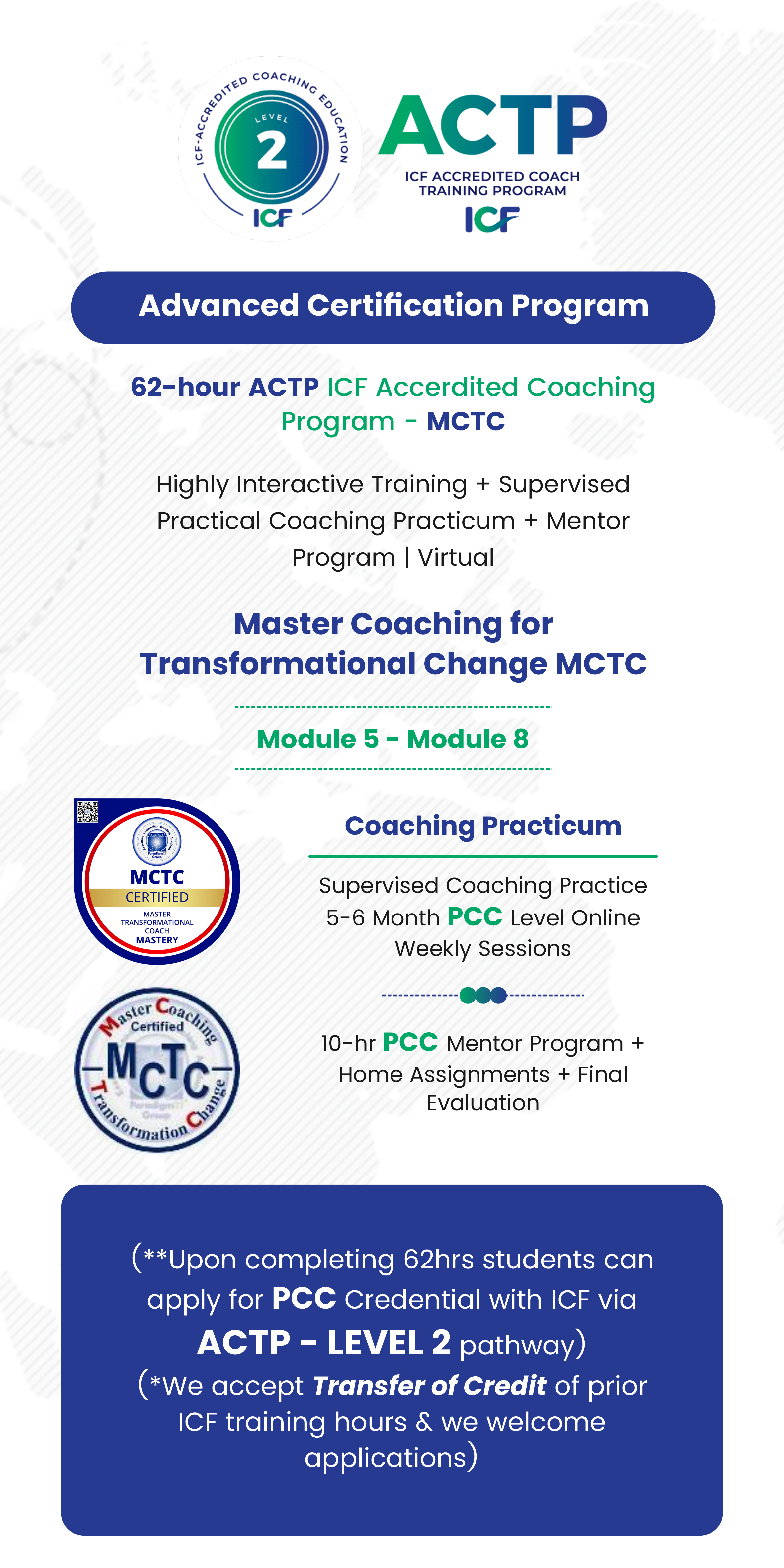 - MCTC Certificate from ICF-accredited institute